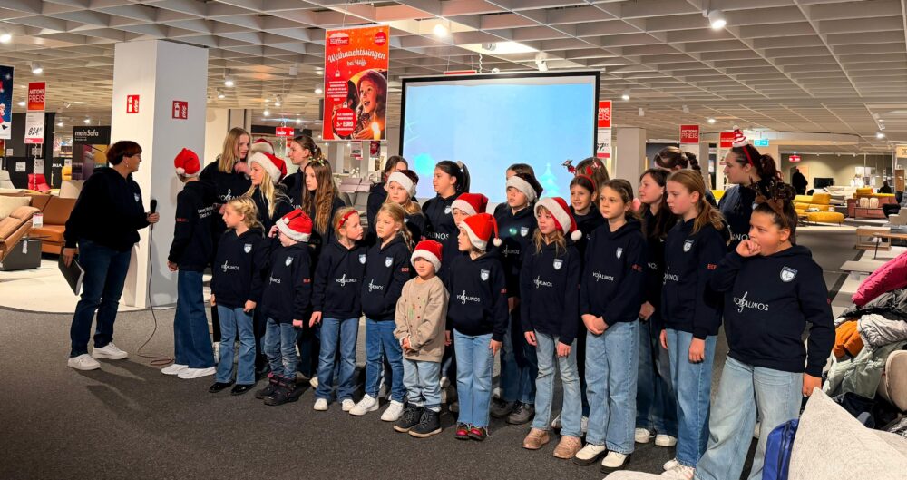 Besonders groß angekündigt war unser Auftritt im Möbelhaus Höffner bereits viele Tage zuvor. Trotz einer Krankheitswelle standen dort am 06.12.2025 stolze 30 Vocalinos auf der Bühne – und schnell hatten wir nicht nur die Eltern, sondern auch zahlreiche weitere Besucher*innen in unseren Bann gezogen. Die Resonanz war überwältigend, und wir fühlten uns sehr willkommen. Es hat uns dort ausgesprochen gut gefallen, und wir freuen uns schon jetzt auf die nächste Einladung.